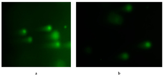 - Singh, N.P.; McCoy, M.T.; Tice, R.R.; Schneider, E.L. A simple technique for quantitation of low levels of DNA damage in individual cells. Exp. Cell Res. 1988, 175, 184–191. [Google Scholar] [CrossRef]