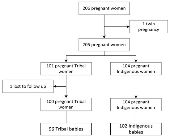 A total of 204 women (99%) from tribal and indigenous communities ultimately participated in this study. All had registered at MMPHCS clinics for ANC. One woman was excluded because of twin pregnancy and one moved abroad. The 178 participating women provided suitable hair samples. One woman had a miscarriage. In total, 203 women delivered infants, with 198 live births and five stillbirths. Of the 198 live births, 96 (48%) were from tribal and 102 (52%) from indigenous women (Figure 1). Four children were born with congenital anomalies (one with Down syndrome, three with hydrocephalus). One of the five stillbirths had congenital anomalies (not specified).