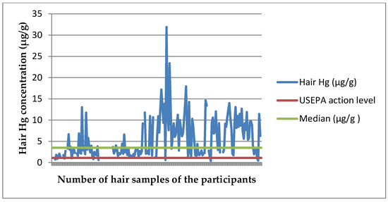 Hair Hg level in the study population was analyzed with the one sample t-test for significance.