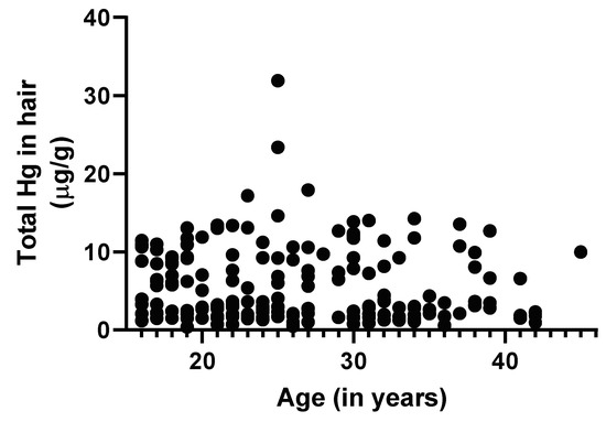 Scatterplot of participants’ age in years and concentrations of total mercury in hair. This included 178 participants. Total Hg concentrations in hair were not significantly correlated with age (r = −0.10, 95% CI −0.25–0.05, p = 0.16).