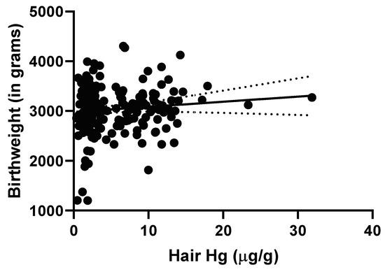 Linear regression of birth weight (in grams) against maternal hair Hg concentration. Estimated slope of the regression line is 10.26 (95% CI −4.54–25.05, r2 = 0.01, p = 0.18).