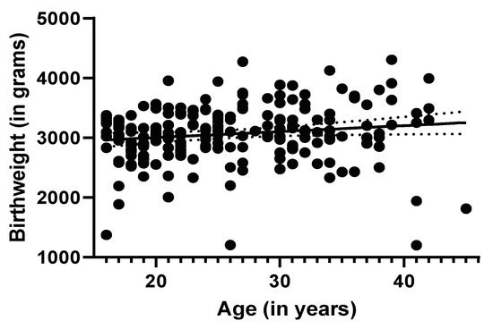 The linear regression of birth weight against maternal age suggested a small, positive relationship (Figure 5). The estimated slope of 9.98 (95% CI 0.64–19.31, r2 = 0.02) was significantly different from 0 (p < 0.04).