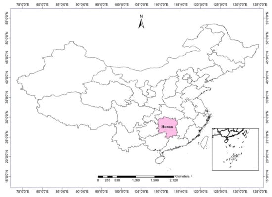Hunan Province is located in the central area of China (north latitude: 24°38′–30°08′; east longitude: 108°47′–114°15′) (Figure 1) and has about 68.99 million resident population in 2018 []. Data were from the two-round health service household interview surveys of Hunan Province, China, which were conducted in 2013 and 2018 by the Center for Health Education and Information Statistics, Health Commission of Hunan Province. Two-round surveys adopted the same sampling framework. Study participants were selected at random using a multi-stage stratified cluster sampling. First, 14 municipalities of Hunan Province were divided into urban and rural sampling points at random (seven for urban points and seven for rural points); one district/county was further chosen from each sampling point randomly (district for urban sampling points and country for rural sampling points). Secondly, the researchers randomly chose 5 towns from each selected district/county. Thirdly, two communities/villages from each selected town (community for district towns and village for rural towns). Lastly, 60 households were selected randomly in each selected community/village and all family members of these 60 households were invited to participate in the survey. Oral consents were obtained before the face-to-face interview for all participants (including adult guardians of children under 10 years old). All data collectors received the standard training organized by the Health Commission of Hunan Province. Strict quality control measures were taken, including field inspection at each sampling district/county, choosing 5% of surveyed households to do a second survey through visiting or calling the households by independent data collectors, use of standard data entry software and implementation of standard logic checking. The survey items used in this study are listed in the Appendix (Appendix A).