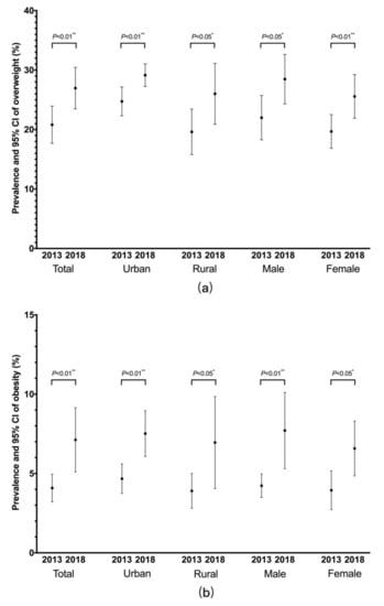 The crude prevalence of overweight increased from 20.81% (95% CI: 17.68–23.95) in 2013 to 26.97% (95% CI: 23.48–30.45) in 2018 (Table 1, Figure 2). Subgroup analyses by place and sex showed significant increases in overweight prevalence rate in all subgroups between 2013 and 2018 (urban area: from 24.73% to 29.14%; rural area: from 19.61% to 26.01%; males: from 22.00% to 28.47%; females: from 19.67% to 25.56%).