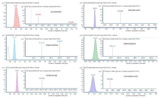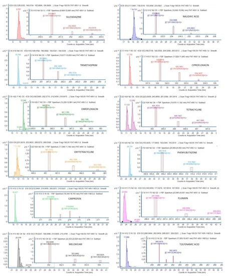 On the contrary, method D (simple extraction of plasma with methanol) provided very good recoveries for all the compounds at 100 ng mL−1 and for all the concentrations tested to validate the technique (Table 3). The high correlation coefficients, all above 0.98 except for carprofen (0.97), indicate very good correlations between concentrations of antibiotics and areas of the chromatographic peaks. Likewise, the method was considered precise, as RSD of repeatability and reproducibility were <20%, which is the threshold set to accept the validation of the analytical method [39]. Possible matrix effects may enhance or suppress ionization, leading to over- and under-recovery of some compounds. As shown in Table 3, recoveries for all the compounds were above 70%, except for meloxicam and carprofen at 25 ng mL−1 (30.65% and 52.38%, respectively). However, both compounds showed good linearity and precision values, which are needed to accept recoveries below 60% (but in any case >30%) in multiresidue methods [39]. The limit of quantification (LOQ), defined as the lowest concentration at which the analyte can be quantitated with a precision and accuracy of greater than 15%, was 25 ng mL−1 for all the compounds except carprofen and meloxicam (50 ng mL−1). Chromatograms of each antibiotic and NSAID detected by the validated method are shown in Figure 1.