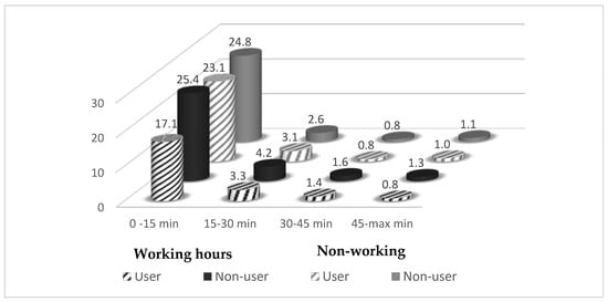 Figure 1 presents the frequency of sitting bouts of different durations for working and non-working hours for users and non-users. Bouts of 0–15 min were most prevalent during both working and non-working hours and bouts of 45 min or (much) longer were rare. For users, during working hours, the number of short sitting bouts (0–15 min) was relatively low (17.1) compared to non-users. This reflected the lower number of sit-to-stand transitions during working hours for users compared to non-users.