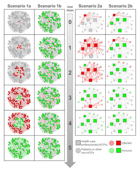 Network scenarios of the spread and immunization at the beginning of an infectious disease. Each time step indicates a time period in which one person infects R0 other persons. Health care professionals (HCPs) are represented as rectangles, and non-HCPs are represented as circles. The colors depict the health status: red (infected), green (immune), gray (neither infected nor immune). In condition (a), HCPs can be infected, and, in condition (b), HCPs cannot be infected. Scenario 1: The organization of a health care provider, including HCPs and non-HCPs. In Scenario 1a, all 265 persons were infected over time compared to only 53 persons in Scenario 1b. Scenario 2: Department within a health care provider including HCPs and patients. The size of the nodes indicates the number of contacts to other nodes. In Scenario 2a, all 20 persons were infected compared to only 4 patients in Scenario 2b. Created with the software Visone [19] (see Supplementary Materials, for the external xlsx data base that was used for graphics).