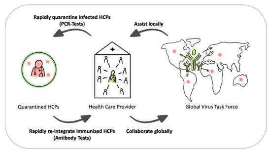 Reverse transcription polymerase chain reaction (RT-PCR) and antibody tests would enable the identification of infected HCPs and those who acquired immunity to either (1) rapidly quarantine them, thus preventing the infection (and quarantine) of a large number of additional HCPs as well as patients, or (2) help reintegrate them into epidemic hotspots where they can now safely contribute to the health care system. As one measure within a comprehensive intervention portfolio, immune HCPs could serve as a “virus task force without borders” to help minimize the infection of additional super-spreaders (e.g., susceptible HCPs) and thereby ward off the pandemic spread in other regions where they are needed (see Figure 2).
