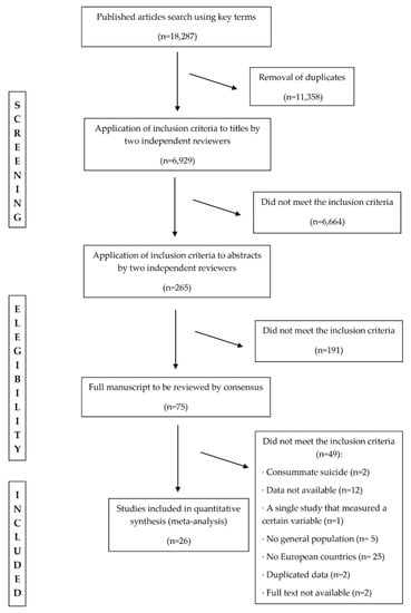 Two independent reviewers carried out the selection process, resolving the discrepancies through a third reviewer. The number of potentially eligible records identified through electronic searching was 18,287. After removing 11,358 duplicated articles, two independent reviewers screened the remaining 6929 records by applying the inclusion criteria to the titles and abstracts. As a result, 75 papers were reviewed by reading the full manuscript, of which 49 were eliminated due to including completed suicide but not suicidality (n = 2); data not being available (n = 12); being the only study that measured a certain factor, and thus being eliminated as it could not be compared with other studies (n = 1); not dealing with the general population (n = 5); not being conducted in Europe (n = 25); displaying duplicated data (n = 2) and the full text not being available (n = 2). Finally, a total of 26 studies on associated factors for suicidality were included in the present study (Figure 1).