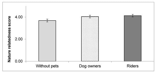 Riders had significantly higher nature relatedness compared to people without pets but were similar to dog owners, which also showed higher scores than people without pets (Table 1). Dog owners often live near green spaces to walk their dogs [86,87], and nearby nature is associated with psychological and social health benefits [31], but we have no evidence that they also have high nature relatedness.