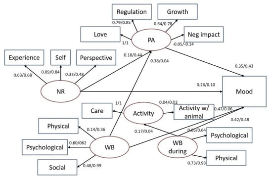 Figure 2 shows the structural equation model applied to nature relatedness (NR), pet attachment (PA) and wellbeing (WB) and mood ratings. Only riders and dog owners were included in this analysis because we had not assessed pet attachment in controls.