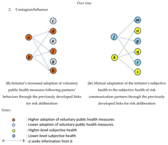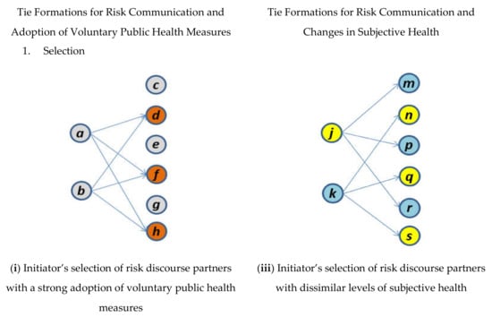 Several concepts have been developed in sociology [] but are not fully utilized in risk governance and communication. These concepts including selection (or homophily) versus contagion (or influence) and the social network analysis technique for the coevolutionary process between network formation and behavioral changes [], which will be discussed later, allow us to tackle the theoretical and empirical aspects of the longitudinal mutual interactions between the emergence of health communication and the progress of health-related behaviors. Selection (or homophily) takes place when the formation of ties is initiated based on similar individual attributes or the same characteristics between actors []. In contrast, contagion (or influence) occurs when ties between actors are first developed, and then, their distinct individual properties are mutually and gradually adapted to each other via the previously established links [,]. As mentioned above, multiple causal mechanisms compete to explain: (i) the development, maintenance, or termination of a tie in any pair of two actors in a risk communication network (i.e., selection mechanism); and (ii) the health-related behavioral changes that occur through each actor’s connections with other people when deliberating about health risk (i.e., influence or mutual adaptation mechanism) [].