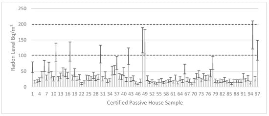 Passive House Sample (97 homes) with National Reference/Action Level 200 Bq/m3 and WHO recommendation/Target Level 100 Bq/m3 shown with the dashed lines.