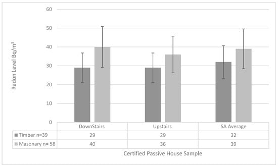 While the influence of building materials on indoor radon concentrations is recognized, there is a paucity of quantitative data representing the structural contribution to domestic radon. A figure of 20 Bq/m3 has recently been suggested for the contribution from building materials to indoor radon concentrations [33]. In this passive house study, 58 dwellings are constructed from masonry and the remining 39 dwellings are of timber frame construction. The analysis of the results shown in Figure 4 reveals that the timber frame sample has a slightly lower radon level than the masonry group. This corresponds with previous research [37]. However, as the number of houses investigated in this research was relatively small, and it was not the key focus of the research, the results should be treated with caution.
