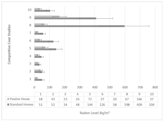 A total of 10 comparative case studies were also carried out, which were in known high risk areas. For each case study, the comparison between a certified passive house and the home directly next door was performed. It is noted that a significant variance can be found between neighbouring dwellings. The correlation of these findings is still interesting as the conventional homes demonstrate elevated radon levels in all 10 case studies. As shown below in Figure 5: