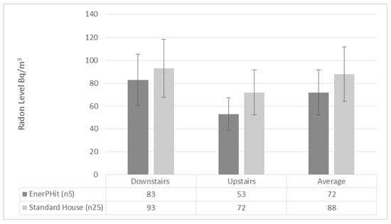 Figure 6 above presents a comparison of the EnerPHit or Passive House retrofit homes against the comparison homes measured in this study. The average result for the EnerPHit sample was 72 Bq/m3 which was lower than the standard house sample of 88 Bq/m3.