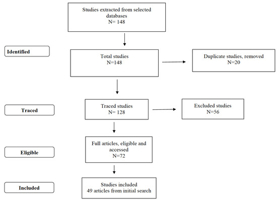 In total, 148 studies were initially identified, 20 of which were excluded because they were repeated. Of the 128 remaining studies, 56 were excluded for not addressing this review’s objective. The full texts of 72 studies were analyzed, although 23 did not meet the eligibility criteria, so 49 studies remained and composed the final sample of this systematic review (Figure 1).