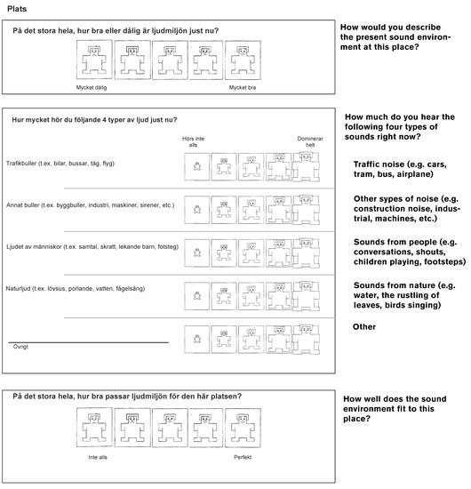 Based on a series of consistent protocols and research works carried out by different working groups reported in the Introduction [36,37,38,39,40], the authors of the present paper developed a survey with three questions (see Figure 1). The questions were divided in three topics: quality of the sound environment; sources heard; and appropriateness of the sound environment, in the sense of fitness. The survey was made in Swedish; for the present purpose, an English translation is added.