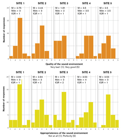 The histograms for questions Q1 and Q3 (Figure 3) showed slightly skewed distributions in most cases (here indicated by differences between the Mean value, M, and Median value, Mdn). This gave a first indication on the relationship between the questions about quality (Q1) and appropriateness (Q3), i.e., the skewness tended to follow the same direction when comparing pairs from these two questions, except for Site 5. This is investigated further below. Furthermore, the resulting Interquartile Range (IQR) values reflected a greater agreement among the children on the sound environment quality (Q1) than on the appropriateness (Q3). Furthermore, the resulting mean values showed that the children in general rated the sound environment appropriateness to the site (Q3) higher than its sound quality (Q1).