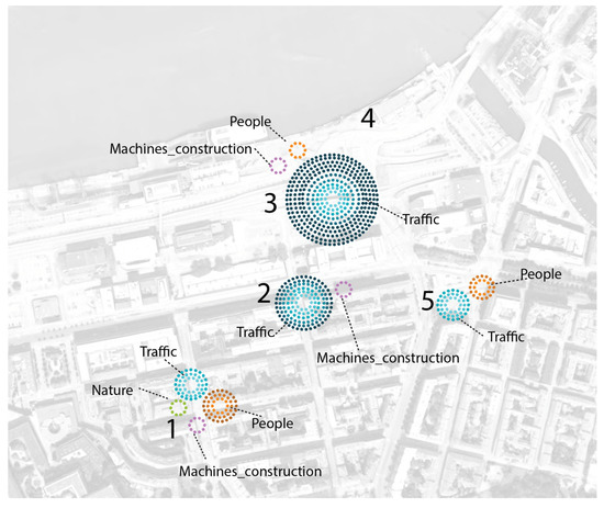 Figure 4 presents a graphical tool for visualizing the domain responses of the sound sources. Each circle corresponds to 10% of the participants giving clear dominance values (pictograms corresponding to the fourth and fifth dominance on the 1–5 scale) to that particular noise source. We can see, for example, that Site 4 had a sound environment where none of the sound sources was marked as dominant. Site 3 was clearly dominated by traffic noise, which 100% of the children reported as dominant. Site 1 seemed to be more balanced, reflecting the presence of the four sound sources, although with a greater presence of traffic noise and people.