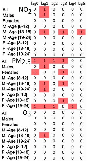 Qualitative representation of the associations by sex and age group for three air pollutants: red (1)—positive statistically significant, white (0)—neutral. F—female, M—male. Lags are in days. Toronto, Canada, 2004–2015.