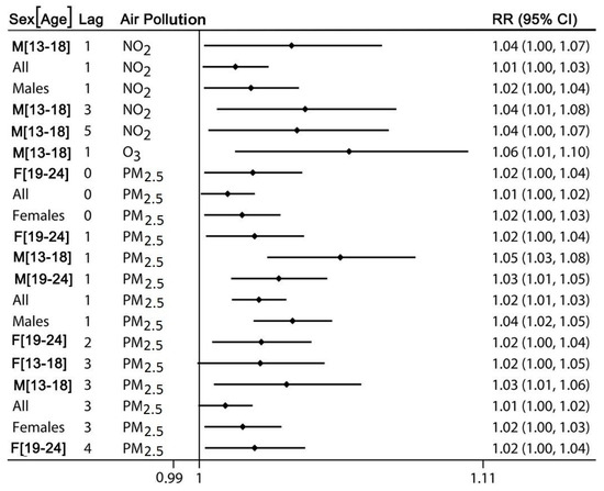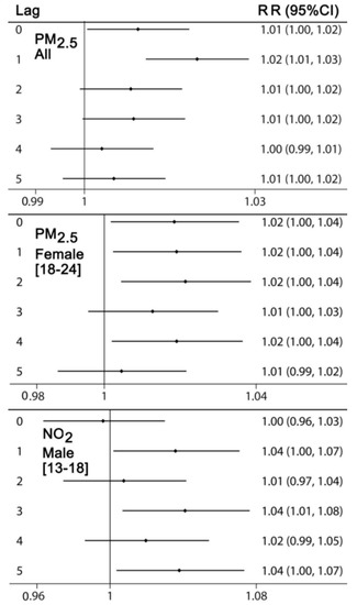 Relative risks (RR) and their 95% confidence intervals (CI) for fine particulate matter (PM2.5) (all patients and female individuals of age 19 to 24 years) and NO2 (male individuals of age 13 to 18 years). Lags are in days. Toronto, Canada, 2004–2015.