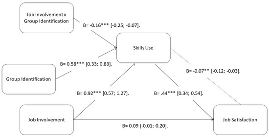 Lastly, when assessing the moderated mediation, we affirmed that it was statistically significant. Job involvement (X) showed an impact over job satisfaction (Y). Moreover, the relationship with skill use (M) was moderated by group identification (W) (B = −0.07, SE= 0.02, 95% CI (−0.12; −0.03)). Specifically, at lower levels of group identification, job satisfaction values were higher. At the 16th percentile level, the coefficient was B = 0.21, SE = 0.04, 95% CI (0.13; 0.29). At the 84th percentile level, the coefficient was B = 0.10, SE = 0.03, 95% CI (0.05; 0.16).