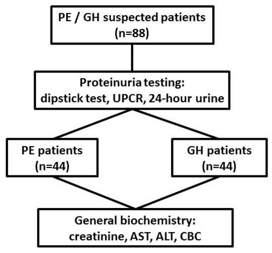 Study flow diagram. Patients were classified into two groups based on clinical features and proteinuria assessment: preeclampsia (PE) group (n = 44) or gestational hypertension (GH) group (n = 44), and general biochemistry tests were performed. UPCR: urine protein-to-creatinine ratio, AST- aspartate aminotransferase: ALT-alanine aminotransferase: CBC-complete blood count.