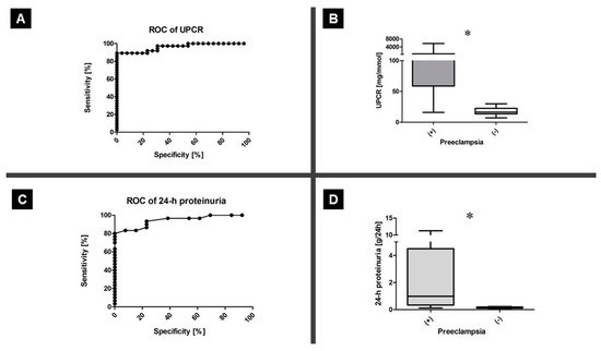 Proteinuria testing. Protein loss was assessed by determining the UPCR and performing the 24 h urine test. The UPCR cutoff of 30 mg/mmol was adequate for the diagnosis of preeclampsia (A). The UPCR values increased in the PE group (B). For the cutoff value of 0.26 g/24 h, the total protein level in 24 h urine samples was adequate for the diagnosis of PE (C). Total protein was increased in the PE group (D); * p < 0.05.