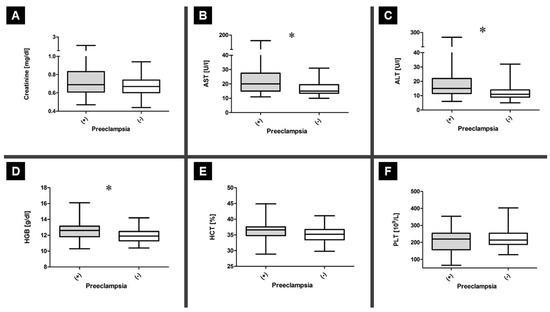 General biochemistry testing. The levels of creatinine (A), AST (B), ALT (C), hemoglobin (Hgb0) (D), hematocrit (HCT) (E), and platelet count (PLT) (F) were compared between the PE and GH groups. Significant differences in AST, ALT, and PLT (F) were compared between the PE and the GH groups. Significant differences in AST, ALT, and platelet count were noted and indicated with “*”; * p < 0.05.