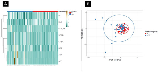 Heat maps and principal component analysis (PCA) analysis. Heat maps based on the Euclidean distance between clusters for patients with PE and GH (A). PCA graph for the PE and GH groups (B). The X and Y axes show principal component 1 and principal component 2, which explain 33.6% and 23.4% of the total variance, respectively.