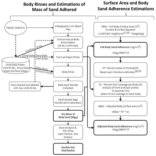 SA values (mg/cm2) were based on staged hand press trials and body rinses following beach play, where Figure 1 is a flowchart of the procedures and methods. This SA normalized parameter is useful for comparison across studies and used in dermal and ingestion exposure estimates. Discussed below are the subjects and location (emphasizing relevance to possible influence on the SA value), procedure for performing the hand press trials and body rinses, collection of other potentially influential variables (e.g., last play activity as determined by video, clothing), determination of hand and body surface areas (i.e., area values used to normalize the mass of sand adhered), determination of Body Sand Adherence values and the statistical routines performed. IRB protocols were approved and established for this project through the University of Miami (IRB 20140140-MOD00023226) and University of Texas (IRB #HSC-SPH-18-0396).