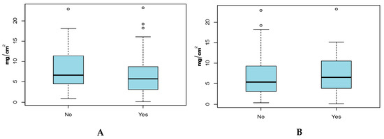 Results (Figure 5) show that the Full-Body SA for the group of children who applied sunscreen was less than the child group who did not apply sunscreen, although reapplying sunscreen resulted in higher Full-Body SA (although difference in means were not statistically significant) for both the first and second application of sunscreen (Table 4). Most subjects applied sunscreen before play (i.e., 99 versus 16), while only 24 reapplied sunscreen during the 1 h of beach play for Full-Body SA. Results (Figure 6) also show that the Adjusted-Body SA for the group of children who applied sunscreen was less than the child group who did not apply sunscreen, and similarly those who reapplied had lower Adjusted-Body SAs. Previously, staged hand press trials for measuring Hand SAs were performed under three conditions of testing: Dry (D), Sunscreen (S), and Wet (W), where wet hands resulted in higher adherences compared to sunscreen and dry hands, and dry hands resulted in slightly higher adherences than sunscreen hands [33]. For the D-S condition, there were no significant differences in variances and means, however for D-W and S-W conditions of testing comparisons, there were significant differences in variances as well as in mean adherences. There were some notable high numbers that can questionably be outliers, however no sound reasoning can be provided to remove them from the analysis. The four apparent outliers for Full-Body SA were three males and one female (Figure 5). For the one subject who did not wear sunscreen, his Full-Body SA was 22.89 mg/cm2. For the three that did wear sunscreen their Full-Body SAs were 18.20 mg/cm2, 19.20 mg/cm2, and 23.17 mg/cm2. Removing these outliers would drop the Full-Body Average SA from 8.83 to 8.09 mg/cm2 for those without initial sunscreen and from 6.36 to 5.93 mg/cm2 for those who used sunscreen. For Adjusted-Body SA there were a number of children that may have been apparent significant outliers in the measure of Adjusted-Body SA for wearing and especially not wearing sunscreen (Figure 6), influencing the average by having a large soil loading on the body and a small surface area over which that soil was distributed. If 5 outliers with Adjusted-Body SA’s over 300 mg/cm2 are removed from the overall average, average Adjusted-Body SA drops from 69.91 to 51.37 mg/cm2.