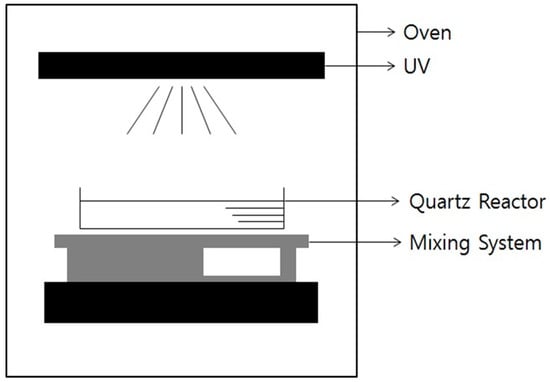 As described in Figure 1, a modified drying oven (900 × 900 × 900 mm3 in size) was used as an experimental apparatus for photocatalytic activity of prepared media. A quartz dish that was 160 mm in diameter and 50 mm in height was used as a reaction vessel to hold 1 L of synthetic wastewater and 1.125 g of photocatalytic media. A UV lamp (Atlantic Ultraviolet, GPH357T5L-17W, USA) was installed on top of the oven for irradiation of the photocatalyst. The distance between the UV lamp and reaction vessel was 50 mm. Synthetic wastewater was prepared to simulate wastewater for reuse in the electronics industry by using 1000 μg/L of spiking isopropyl alcohol, acetone, ethanol, and acetaldehyde. In addition, a removal experiment with UV irradiation was performed for comparison. The concentrations of target compounds were adjusted to 1000 μg/L. Samples from the reaction vessel were taken with time and the concentrations of target compounds were quantified using gas chromatography with mass spectroscopy (GC/MS, gas chromatography 7820A, mass spectrometry 5975, Agilent) coupled with purge and trap (Stratum, Teledyne, Tekmar, USA). The operational conditions of purge and trap were as follows. Sample and purge temperatures were 40 °C. Nitrogen gas was used for purging with a flow rate of 100 mL/min for 8 min. The following conditions were used for GC-MS analysis. The target compounds in the sample were separated with a DB-624 column (Agilent). The temperatures of the inlet and detector were 100 °C and 250 °C, respectively. The oven temperature was held at 35 °C for 7 min and 46 °C for 5 min with a ramping rate of 3 °C/min. Standard solutions for target compounds were prepared by series dilution of stock solution prepared by American Chemical Society (ACS) grade chemicals (Sigma Aldrich). Deviation from calibration curve was checked in every 3–5 samples and kept less than 10%. The concentrations of target compounds in the blank eluent from hollow beads, dissolved in water from air, and in distilled water were measured to correct the baseline as described in the literature [].