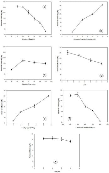 Effects of (a) amount of support, (b) amount of precursor, (c) aging time, (d) pH, (e) amount of water, (f) calcination temperature, and (g) calcination time in preparation of immobilized photocatalyst on the removal efficiency of isopropyl alcohol (tested under synthetic wastewater initial concentration of 10 mg/L).