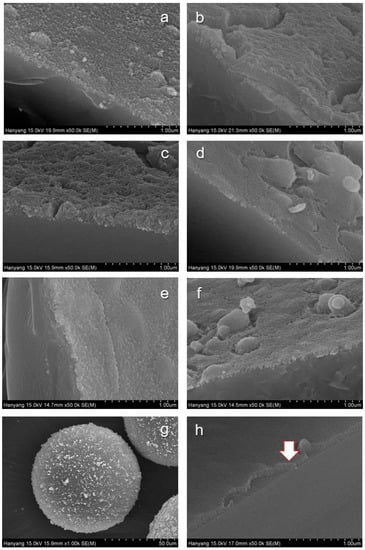 Surface morphologies of photocatalytic media prepared under different conditions: (a) Aging time = 60 min, (b) aging time = 120 min, (c) pH = 1, (d) pH = 7, (e) amount of water = 0.6 mL, (f) amount of water = 3.6 mL, and those prepared in optimized conditions in different magnifications (g) and (h), arrow for deposition of photocatalyst layer in (h).