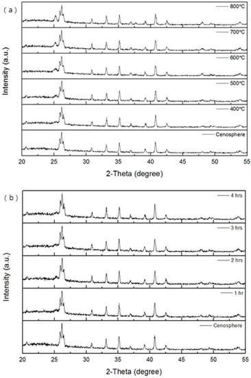 Phase structures of photocatalytic media under different conditions: (a) Calcination temperatures, and (b) calcination times (prepared in the optimized reaction conditions (amount of water = 2.4 mL, amount of precursor = 12 mL, aging time = 60 min, reaction pH = 1, amount of beads = 15 g)).