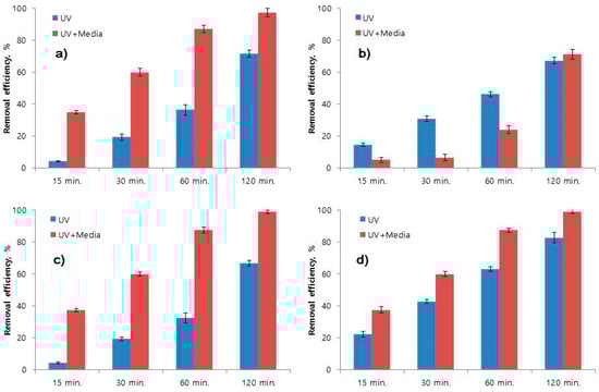 Removal efficiencies of target compounds with immobilized photocatalyst under UV irradiation are presented in Figure 5a–d. In addition, experimental removal efficiencies without photocatalysts (UV only) were included in the figures for comparison. The removal efficiencies of isopropyl alcohol, ethanol, and acetaldehyde with immobilized photocatalyst are clearly higher than those without photocatalysts at all times. However, the removal efficiencies of acetone by photocatalytic media were lower than those with UV only from 15 to 60 min, while they were higher at 120 min. To account for this discrepancy, reaction kinetics were calculated and compared. After trials of fitting experimental data to the rate equations from zero to second order kinetics, the first-order kinetics were determined as follows: