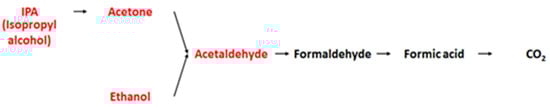 The apparent reaction constants of target compounds are calculated and are listed in Table 2. The reaction constants of isopropyl alcohol and ethanol were determined with a high coefficient of determination (R2 = 0.99), while those of acetone and acetaldehyde were determined with a poor to moderate coefficient of determination (R2 = 0.91 − 0.97). The possible reasons for this poor correlation could have originated from the formation of byproducts. Thus, the consecutive reaction relationships of isopropyl alcohol, acetone, ethanol, and acetaldehyde were considered as shown in Figure 6 [,,,].