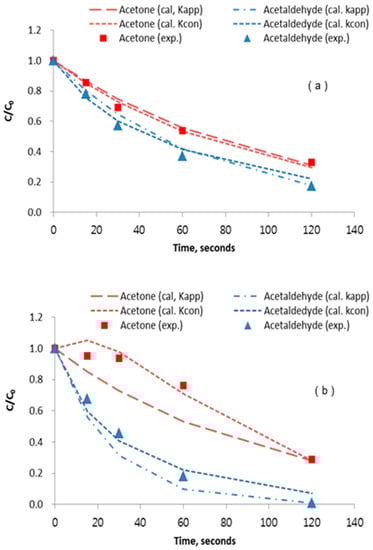 Experimental and calculated values (using Kapp and Kcon) of acetone and acetaldehyde by (a) UV, and (b) UV + photocatalytic media.