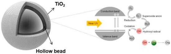Authors suggested the immobilization of photocatalysts on hollow beads by chemical vapor deposition in the previous study for fluidized bed operation []. In this study, an extensive and systematic study was performed to optimize various factors in preparation conditions via efficient sol-gel routes to immobilize a photocatalyst on a hollow bead, as described in Scheme 1. In addition, the removal efficiencies of UV + prepared photocatalyst were compared with those of UV only. Furthermore, the reaction kinetics to describe experimental data were investigated and discussed.