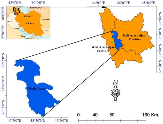 The Urmia Lake is situated in the northwest of Iran, approximately between 45°00′ and 46°00′ East longitudes and 37°00′ to 38°16′ North latitudes. We extracted the study area based on the water body of the year 2000 (Figure 1). The lake’s water is very saline such that only some species of crustaceans (Artemia), diatoms, and phytoplanktons can cope with it. However, the Lake Urmia National Park, whose surface area varies between 4750 and 6100 km2, is one of the nine biosphere reserves in Iran, where 212 bird species, 41 reptiles’ species, 27 species of mammal, 26 species of fish, and 7 amphibian’s species consist its wildlife [25,34]. Lake Urmia is regarded as a shallow lake with a maximum depth of 16 m [35], 1275.6 m above sea level [36], and an area of 5067.142 km2. It is the biggest lake in the Middle East. According to Emdadi et al. [37], the average annual precipitation and average annual temperature of the lake are about 341 mm and 11.2 °C, respectively. Moreover, the lake is the second largest hypersaline lake worldwide with total dissolved salts of 200 g/L in comparison with the normal salinity of approximately 35 g/L [37,38,39,40].