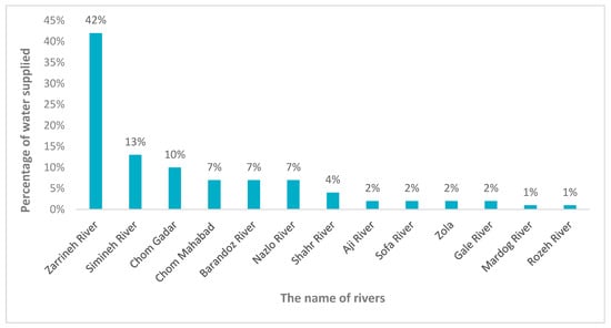 About 13 major rivers drainage surface streams in the Urmia Basin, contributing ~6000 million cubic meters of water annually to the lake. [37]. The Simineh and Zarrineh Rivers are the main perennial rivers, originating from the Zagros Mountains of the Kurdistan provinces in the southeast part of the Lake Basin, in the Miandoab alluvial plain. About 50% of the water reaching Lake Urmia is from these two rivers [38]. The Zarrineh River is the largest river of the basin, supplying 42% of the lake water, while 13% of the water is supplied by the Simineh River that is the second largest supplier of the lake. However, damming on these rivers and their tributaries from the year 2000 onwards, which are the most important suppliers of Lake Urmia, has resulted in a decreased percentage of water supplies of the rives and their tributaries (Figure 3).
