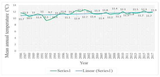 Results show that the increased temperature and decreased rainfall, as well as excessive damming in the Urmia Basin are key factors in declining of the water level. Based on the analysis of the temperature data, the gradually increased temperature from 1986–2017 could be considered as one of the main reasons for the declining of water body of the lake. On the other hand, the average annual temperature in the northwest of Iran will reach about 23 °C in the next few decades [52], which itself leads to a climate change from semidesert to desert. It is noted that, average annual temperature in the northwest of Iran will decrease by 3%. Investigation over the mean annual temperature values demonstrates that the average temperature was nearly 9.7 °C until 1996 in the study area [37]. However, the temperature began to increase from 1996 onwards. The raising rate from 1996 to 2001 is estimated to be nearly 12.7% [37] and from 1986 to 2017 was nearly 19% (Figure 5).