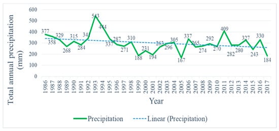 Furthermore, the analysis of the precipitation data indicates that another major testimony for water subsidence in Lake Urmia is the rainfall reduction from 1986–2017. Figure 5 clearly illustrates that the continuous decline in precipitation values is another noticeable factor in shrinking out of the water level of Lake Urmia. A significant decline was seen in precipitation from 1986–2017, where it was 377 mm in the year 1986 and only 184 mm by 2017. The total annual precipitation from 1986–2017 has a decreased value of about 62% (Figure 6).