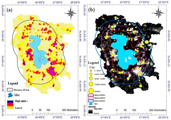The impact of salt storms on the societies; (a) focal radius 60 km from Lake Urmia and (b) the radius of the salt storm crisis on human centers.
