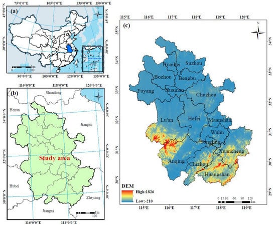 The study area: (a) the location of Anhui Province in China; (b) the administrative division of Anhui Province; (c) the digital elevation model (DEM) of Anhui Province.