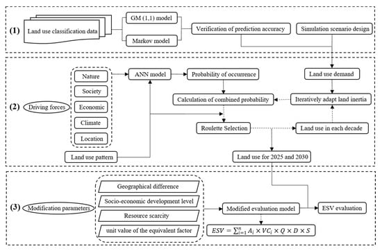 The framework of this study: (1) prediction of land use structure; (2) Land use layout simulation using FLUS model; (3) ESV estimation using the revised model.