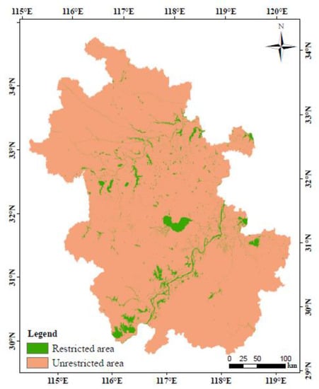 First, land use types with the highest ESV are not allowed to be converted into other land use types. In our previous research, water area was proven to be the land use type with the greatest ESV. Therefore, we set the water area as the restricted area here (Figure 3).