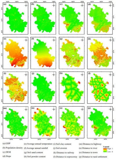 All the data of the driving factors were normalized and exported as raster type data (Figure 4). The data of the GDP, population density, DEM, and soil attribute data were obtained by resampling the original data. Slope data were obtained by performing slope analysis on the DEM data using the ArcGIS software package. The annual average temperature and annual rainfall data were obtained using spatial interpolation analysis combined with meteorological station data. Soil erosion data were calculated using the improved soil loss estimation model [60]. Traffic location data were obtained using the distance analysis tool in ArcGIS.